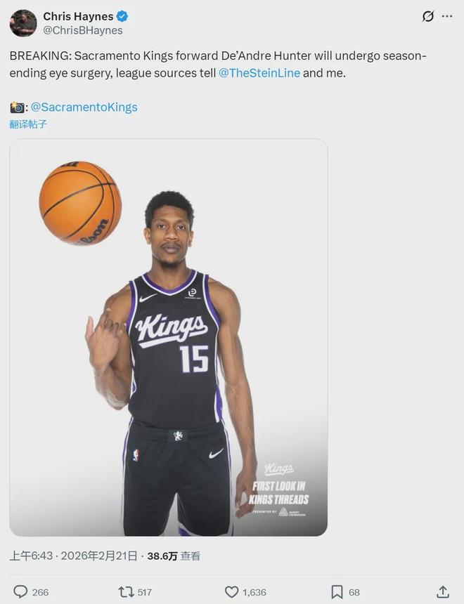 北京時間2月21日上午,據(jù)NBA名記Chris Haynes報(bào)道,國王前鋒德安德烈-亨特接受眼部手術(shù),本賽季報(bào)銷!最近三天,國王已經(jīng)有三名主力賽季報(bào)銷:小薩博尼斯接受左膝半月板撕裂修復(fù)手術(shù);拉文接受右手無名指肌腱修復(fù)手術(shù)。